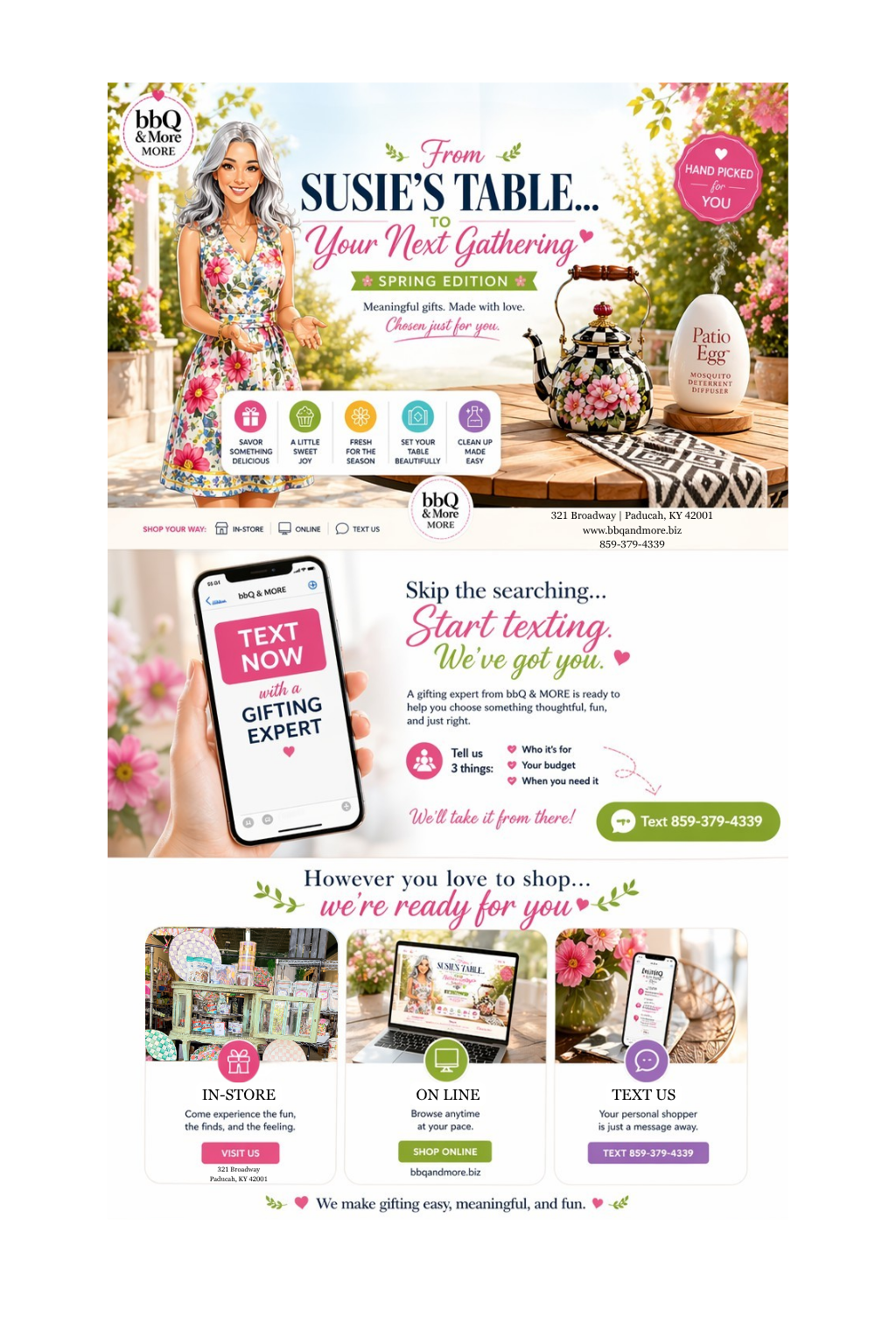 “BBQ and More is my “go to” spot for all of my gifting needs. I text directly to my personal shopping concierge and my items are ready for pick up (gift wrapped). I love to cook and bake. BAM has a large selection of top brand kitchen and houseware items. I am obsessed with MacKenzie Childs, Nora Fleming, Cookies in a Bag by Danette, and Geometry Towels. BAM is always bringing in new and exciting gourmet goodies and treats. Hostessing a party? Go to BAM! Needing a gift? Go to BAM! Needing some retail therapy/self care? Go to BAM! Best selection and customer service in Paducah!”